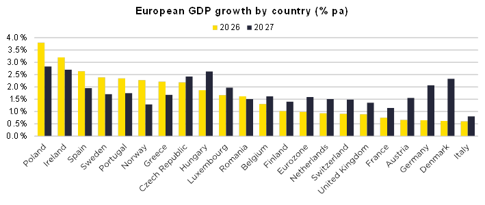 Dies steht in engem Zusammenhang mit den neuesten Prognosen zum BIP-Wachstum in Europa. Oxford Economics geht davon aus, dass das BIP-Wachstum in der Eurozone 2026 1,0 % und 2027 1,6 % erreichen wird. In ganz Europa wird erwartet, dass die Volkswirtschaften Mittel- und Osteuropas sowie Südeuropas im Jahr 2026 das stärkste BIP-Wachstum verzeichnen werden, angetrieben durch eine stärkere Binnennachfrage und Investitionen. Die wirtschaftlichen Aussichten für Westeuropa dürften sich im nächsten Jahr deutlich verbessern. Für Deutschland wird beispielsweise für das Jahr 2027 ein BIP-Wachstum von über 2 % erwartet.
